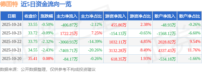 证券之星消息,截至2025年10月24日收盘,德固特(300950)报收于33.55元,下跌0.5%,换手率6.33%,成交量5.72万手,成交额1.92亿元。