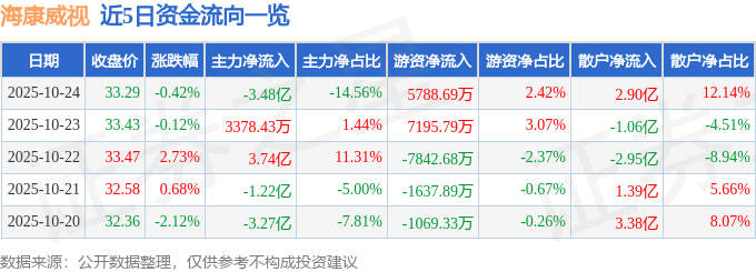 证券之星消息,截至2025年10月24日收盘,海康威视(002415)报收于33.29元,下跌0.42%,换手率0.79%,成交量71.58万手,成交额23.92亿元。