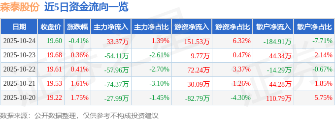 证券之星消息,截至2025年10月24日收盘,森泰股份(301429)报收于19.6元,下跌0.41%,换手率2.77%,成交量1.22万手,成交额2399.49万元。