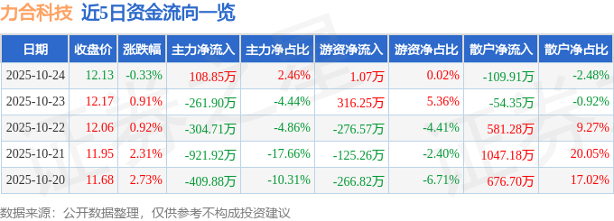 证券之星消息,截至2025年10月24日收盘,力合科技(300800)报收于12.13元,下跌0.33%,换手率1.56%,成交量3.65万手,成交额4433.17万元。