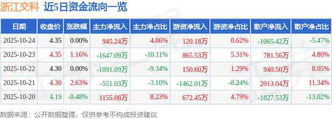 证券之星消息,截至2025年10月24日收盘,浙江交科(002061)报收于4.35元,上涨0.0%,换手率1.72%,成交量44.8万手,成交额1.95亿元。