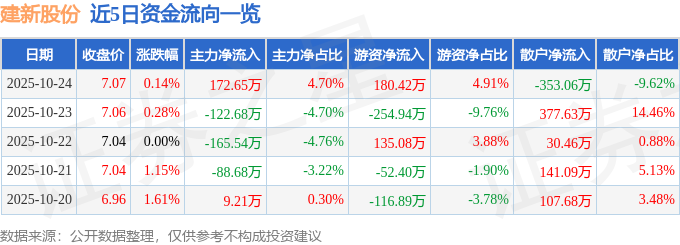 证券之星消息,截至2025年10月24日收盘,建新股份(300107)报收于7.07元,上涨0.14%,换手率1.49%,成交量5.19万手,成交额3671.65万元。
