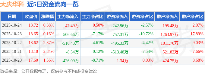 证券之星消息,截至2025年10月24日收盘,大庆华科(000985)报收于18.72元,上涨0.38%,换手率3.9%,成交量5.05万手,成交额9445.0万元。