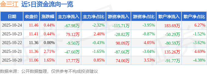 证券之星消息,截至2025年10月24日收盘,金三江(301059)报收于11.46元,上涨0.44%,换手率1.24%,成交量2.56万手,成交额2929.77万元。