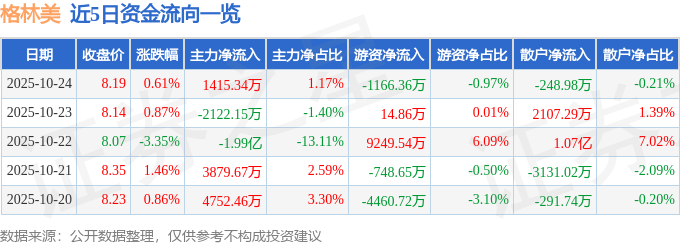 证券之星消息,截至2025年10月24日收盘,格林美(002340)报收于8.19元,上涨0.61%,换手率2.9%,成交量147.4万手,成交额12.06亿元。