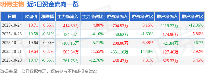 证券之星消息,截至2025年10月24日收盘,明德生物(002932)报收于19.71元,上涨0.66%,换手率2.8%,成交量4.38万手,成交额8637.3万元。