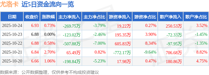 10月24日的资金流向数据方面,主力资金净流出269.75万元,占总成交额3.79%,游资资金净流入19.22万元,占总成交额0.27%,散户资金净流入250.53万元,占总成交额3.52%。
