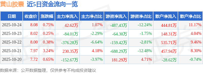 证券之星消息,截至2025年10月24日收盘,黄山胶囊(002817)报收于8.08元,上涨0.75%,换手率1.7%,成交量4.94万手,成交额3982.26万元。