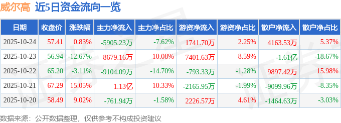 证券之星消息,截至2025年10月24日收盘,威尔高(301251)报收于57.41元,上涨0.83%,换手率24.98%,成交量13.47万手,成交额7.75亿元。