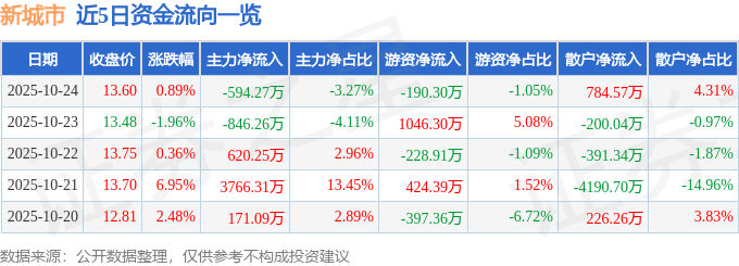 证券之星消息,截至2025年10月24日收盘,新城市(300778)报收于13.6元,上涨0.89%,换手率6.55%,成交量13.33万手,成交额1.82亿元。