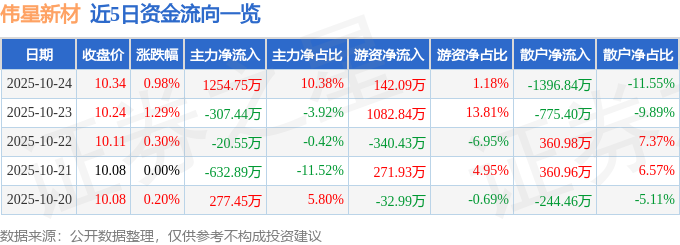 证券之星消息,截至2025年10月24日收盘,伟星新材(002372)报收于10.34元,上涨0.98%,换手率0.8%,成交量11.75万手,成交额1.21亿元。