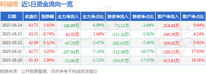 证券之星消息,截至2025年10月24日收盘,科瑞思(301314)报收于43.75元,上涨1.02%,换手率3.64%,成交量5912.0手,成交额2586.13万元。