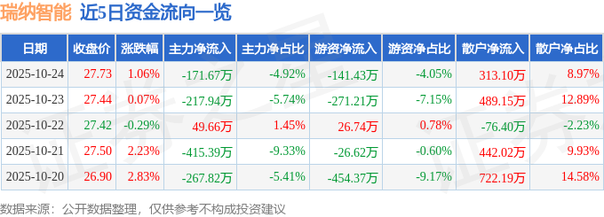 证券之星消息,截至2025年10月24日收盘,瑞纳智能(301129)报收于27.73元,上涨1.06%,换手率3.37%,成交量1.26万手,成交额3490.67万元。