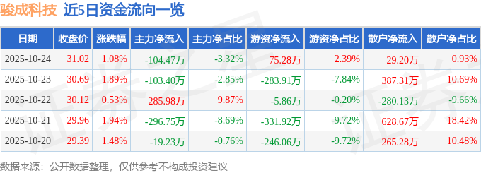 证券之星消息,截至2025年10月24日收盘,骏成科技(301106)报收于31.02元,上涨1.08%,换手率1.0%,成交量1.02万手,成交额3150.63万元。