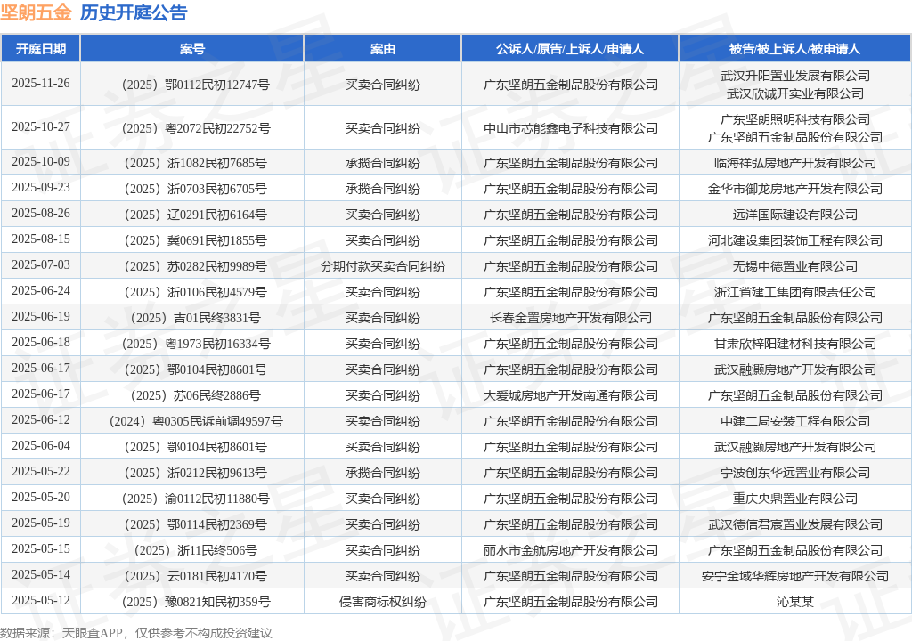 案号:(2025)粤2072民初22752号根据统计,近一年内以广东坚朗五金制品股份有限公司为当事人的历史开庭公告有65则,其中案由为“买卖合同纠纷”的公告以44则居首,其次为“票据追索权纠纷”有7则,“承揽合同纠纷”有4则。历史开庭公告(前20条)如下: