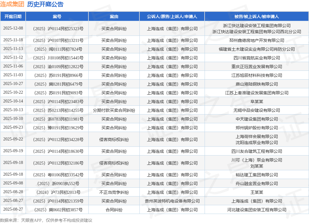 案号:(2025)冀0281民初6479号根据统计,近一年内以上海连成(集团)有限公司为当事人的历史开庭公告有167则,其中案由为“买卖合同纠纷”的公告以136则居首,其次为“侵害商标权纠纷”有7则,“一般人格权纠纷”有3则。历史开庭公告(前20条)如下: