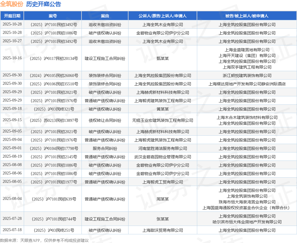 根据统计,近一年内以上海全筑控股集团股份有限公司为当事人的历史开庭公告有93则,其中案由为“破产债权确认纠纷”的公告以18则居首,其次为“装饰装修合同纠纷”有17则,“建设工程施工合同纠纷”有13则。历史开庭公告(前20条)如下: