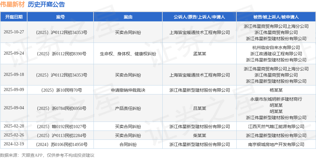 案号:(2025)沪0112民初34353号根据统计,近一年内以浙江伟星新型建材股份有限公司为当事人的历史开庭公告有8则,其中案由为“买卖合同纠纷”的公告以4则居首,其次为“产品责任纠纷”有1则,“合同纠纷”有1则。历史开庭公告如下: