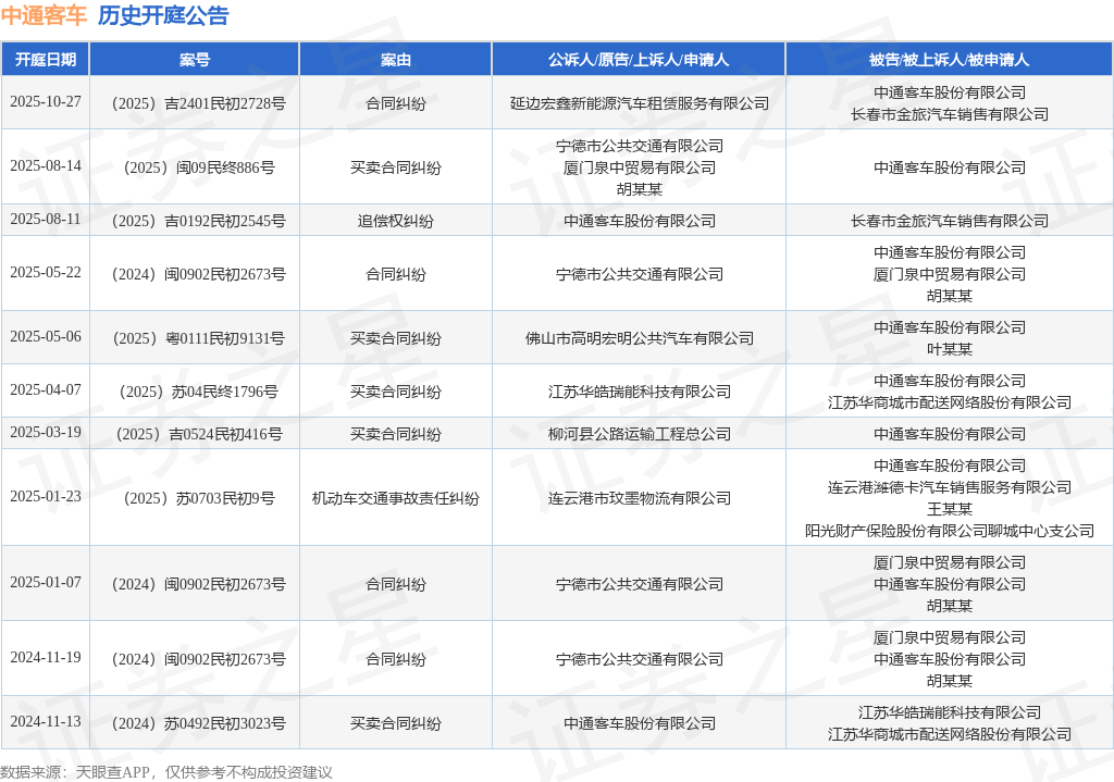 案号:(2025)吉2401民初2728号根据统计,近一年内以中通客车股份有限公司为当事人的历史开庭公告有11则,其中案由为“买卖合同纠纷”的公告以5则居首,其次为“合同纠纷”有4则,“机动车交通事故责任纠纷”有1则。历史开庭公告如下: