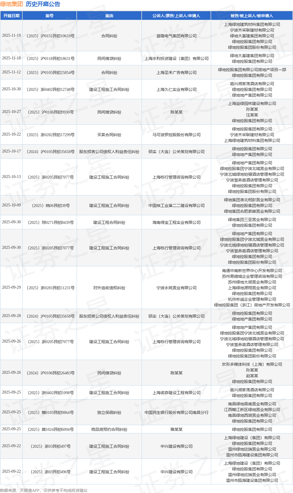 案号:(2025)沪0106民初9930号根据统计,近一年内以绿地控股集团有限公司为当事人的历史开庭公告有204则,其中案由为“建设工程施工合同纠纷”的公告以36则居首,其次为“金融借款合同纠纷”有24则,“合同纠纷”有19则。历史开庭公告(前20条)如下: