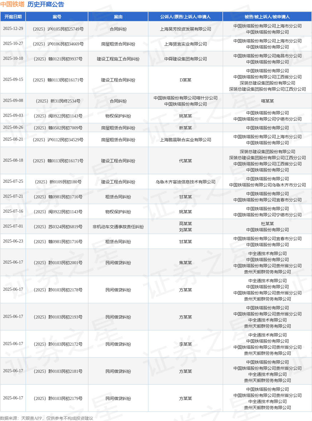 案号:(2025)沪0106民初34669号根据统计,近一年内以中国铁塔股份有限公司为当事人的历史开庭公告有52则,其中案由为“建设工程施工合同纠纷”的公告以8则居首,其次为“房屋租赁合同纠纷”有7则,“民间借贷纠纷”有6则。历史开庭公告(前20条)如下: