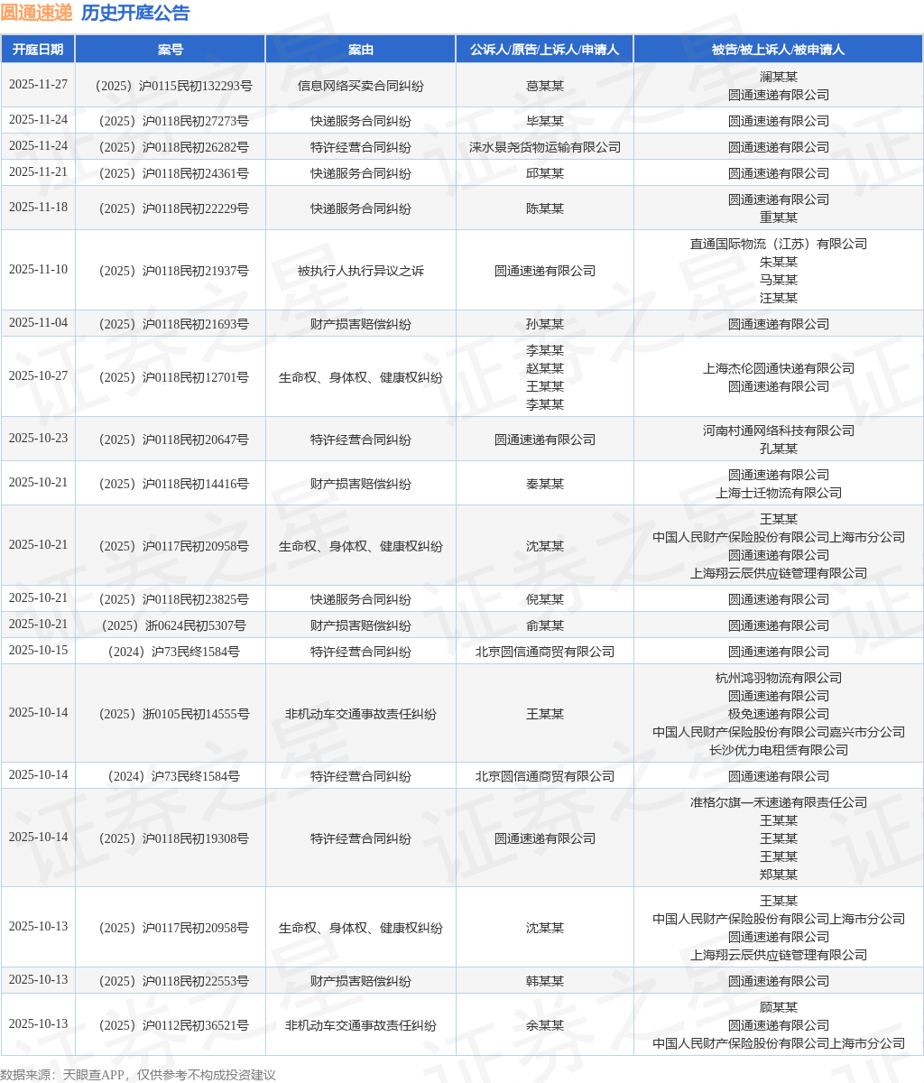 案号:(2025)沪0118民初12701号根据统计,近一年内以圆通速递有限公司为当事人的历史开庭公告有159则,其中案由为“快递服务合同纠纷”的公告以36则居首,其次为“特许经营合同纠纷”有26则,“机动车交通事故责任纠纷”有14则。历史开庭公告(前20条)如下: