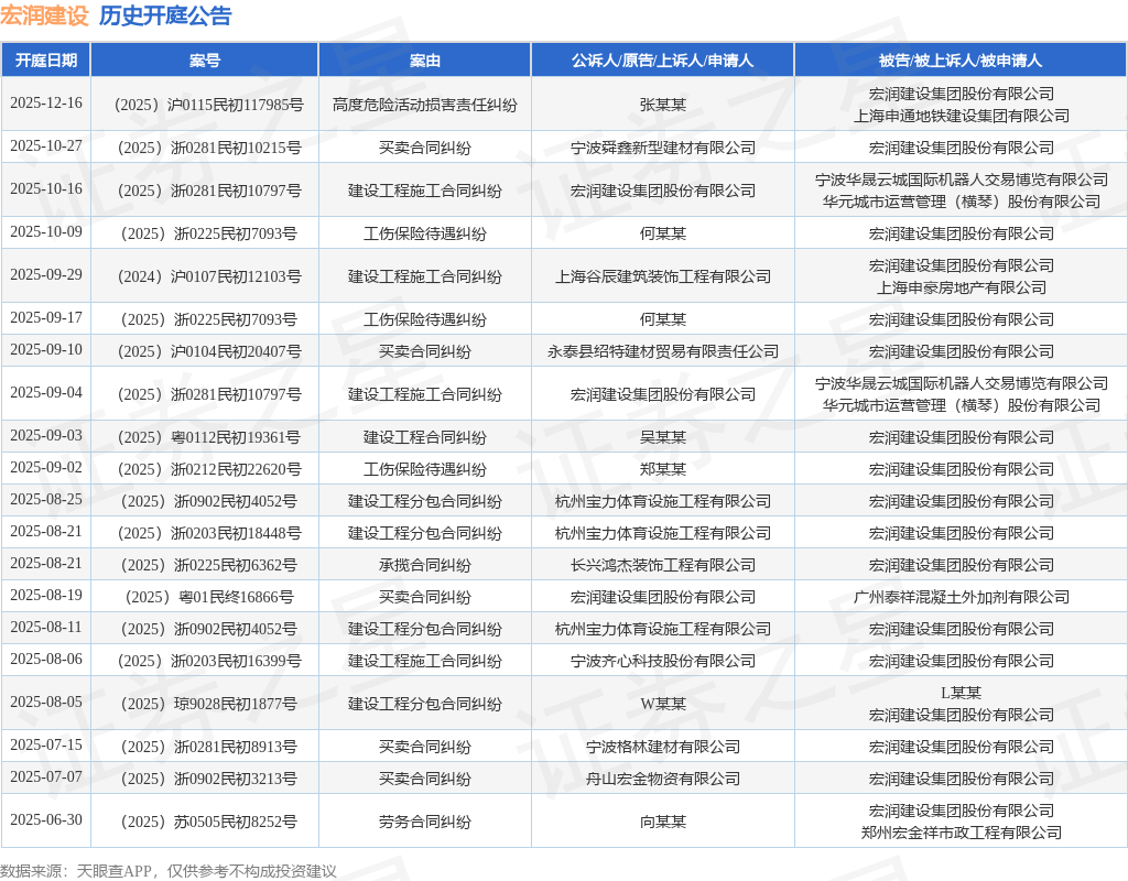案号:(2025)浙0281民初10215号根据统计,近一年内以宏润建设集团股份有限公司为当事人的历史开庭公告有52则,其中案由为“买卖合同纠纷”的公告以17则居首,其次为“建设工程施工合同纠纷”有12则,“工伤保险待遇纠纷”有5则。历史开庭公告(前20条)如下: