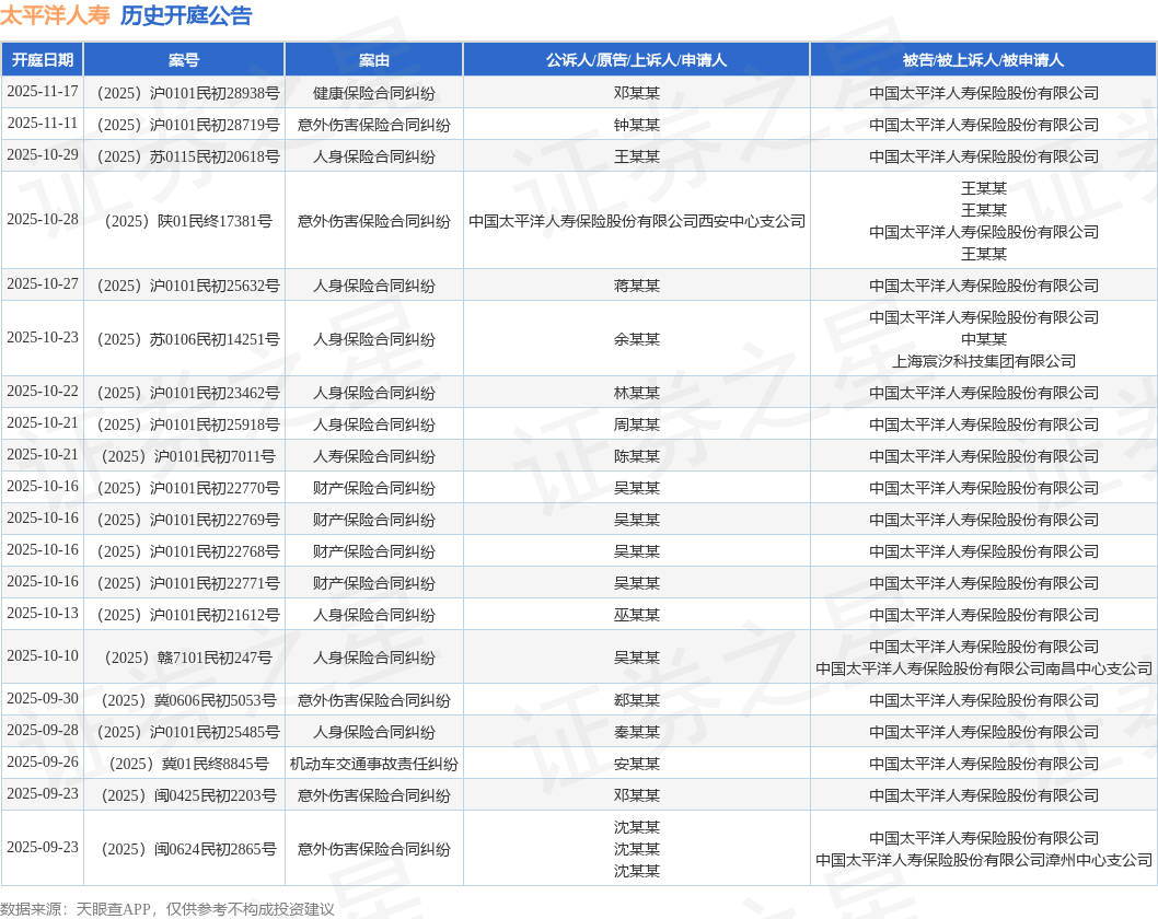 案号:(2025)沪0101民初25632号根据统计,近一年内以中国太平洋人寿保险股份有限公司为当事人的历史开庭公告有154则,其中案由为“人身保险合同纠纷”的公告以95则居首,其次为“意外伤害保险合同纠纷”有16则,“保险纠纷”有14则。历史开庭公告(前20条)如下: