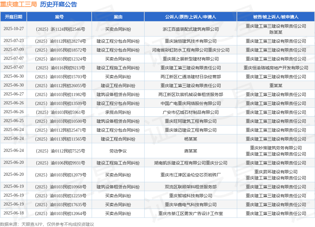 案号:(2025)浙1124民初2546号根据统计,近一年内以重庆建工第三建设有限责任公司为当事人的历史开庭公告有548则,其中案由为“买卖合同纠纷”的公告以213则居首,其次为“建设工程施工合同纠纷”有80则,“建筑设备租赁合同纠纷”有57则。历史开庭公告(前20条)如下: