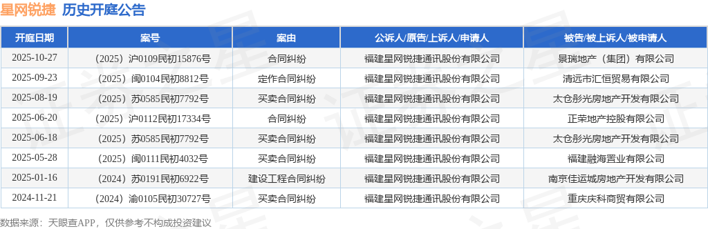案号:(2025)沪0109民初15876号根据统计,近一年内以福建星网锐捷通讯股份有限公司为当事人的历史开庭公告有8则,其中案由为“买卖合同纠纷”的公告以4则居首,其次为“合同纠纷”有2则,“定作合同纠纷”有1则。历史开庭公告如下: