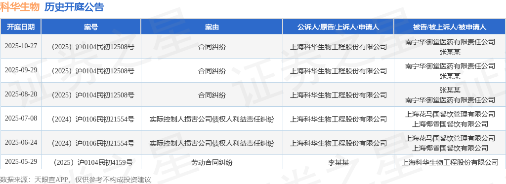 案号:(2025)沪0104民初12508号根据统计,近一年内以上海科华生物工程股份有限公司为当事人的历史开庭公告有6则,其中案由为“合同纠纷”的公告以3则居首,其次为“实际控制人损害公司债权人利益责任纠纷”有2则,“劳动合同纠纷”有1则。历史开庭公告如下: