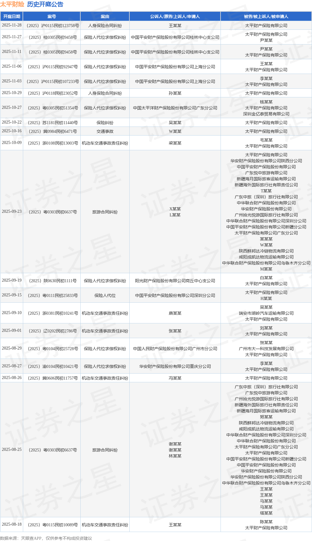 案号:(2025)粤0305民初51354号根据统计,近一年内以太平财产保险有限公司为当事人的历史开庭公告有158则,其中案由为“机动车交通事故责任纠纷”的公告以93则居首,其次为“保险人代位求偿权纠纷”有22则,“保险纠纷”有10则。历史开庭公告(前20条)如下: