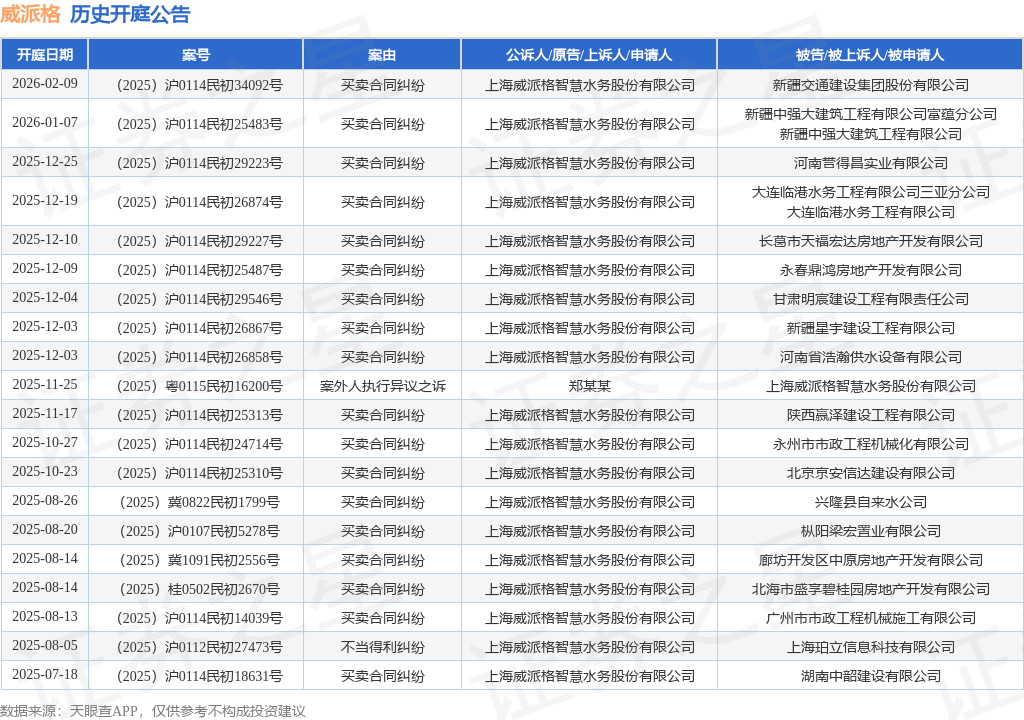 案号:(2025)沪0114民初24714号根据统计,近一年内以上海威派格智慧水务股份有限公司为当事人的历史开庭公告有75则,其中案由为“买卖合同纠纷”的公告以58则居首,其次为“合同纠纷”有6则,“建设工程施工合同纠纷”有3则。历史开庭公告(前20条)如下: