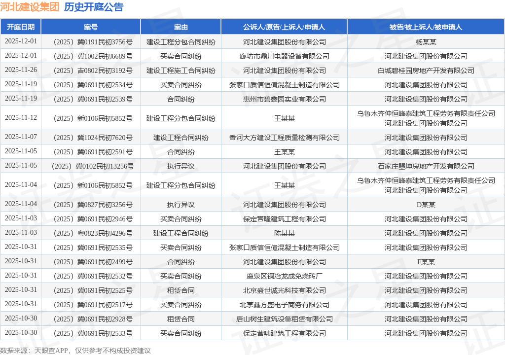 案号:(2025)辽02民终7924号根据统计,近一年内以河北建设集团股份有限公司为当事人的历史开庭公告有1572则,其中案由为“买卖合同纠纷”的公告以640则居首,其次为“建设工程施工合同纠纷”有220则,“劳务合同纠纷”有122则。历史开庭公告(前20条)如下: