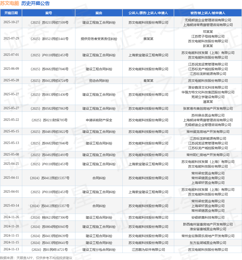 案号:(2025)苏0211民初7109号根据统计,近一年内以苏文电能科技股份有限公司为当事人的历史开庭公告有20则,其中案由为“建设工程施工合同纠纷”的公告以9则居首,其次为“建设工程合同纠纷”有5则,“合同纠纷”有2则。历史开庭公告如下: