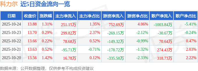 证券之星消息,截至2025年10月24日收盘,科力尔(002892)报收于13.88元,上涨1.31%,换手率2.77%,成交量13.39万手,成交额1.85亿元。