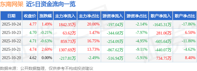 证券之星消息,截至2025年10月24日收盘,东南网架(002135)报收于4.77元,上涨1.49%,换手率1.87%,成交量19.55万手,成交额9213.81万元。
