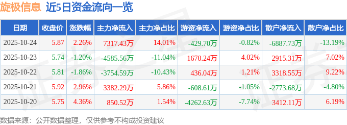 证券之星消息,截至2025年10月24日收盘,旋极信息(300324)报收于5.87元,上涨2.26%,换手率5.22%,成交量89.25万手,成交额5.22亿元。
