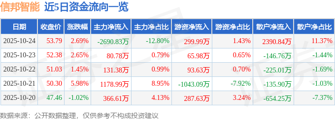 证券之星消息,截至2025年10月24日收盘,信邦智能(301112)报收于53.79元,上涨2.69%,换手率3.57%,成交量3.94万手,成交额2.1亿元。