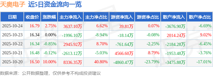 证券之星消息,截至2025年10月24日收盘,天奥电子(002935)报收于16.79元,上涨2.75%,换手率7.78%,成交量32.3万手,成交额5.5亿元。