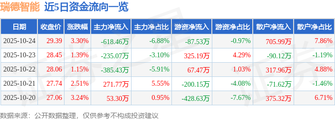 证券之星消息,截至2025年10月24日收盘,瑞德智能(301135)报收于29.39元,上涨3.3%,换手率4.02%,成交量3.07万手,成交额8986.98万元。