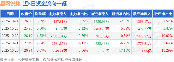 证券之星消息,截至2025年10月24日收盘,星网锐捷(002396)报收于26.86元,上涨3.39%,换手率3.49%,成交量20.38万手,成交额5.42亿元。