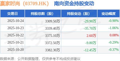 证券之星消息,10月24日南向资金减持29.9万股赢家时尚(03709.HK)。近5个交易日中,获南向资金减持的有4天,累计净减持85.25万股。近20个交易日中,获南向资金减持的有13天,累计净减持222.55万股。截至目前,南向资金持有赢家时尚(03709.HK)3309.5万股,占公司已发行普通股的4.66%。