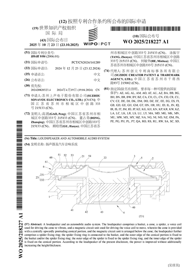 证券之星消息,根据企查查数据显示上声电子(688533)公布了一项国际专利申请,专利名为“扬声器及汽车音响系统”,专利申请号为PCT/CN2024/141289,国际公布日为2025年10月23日。