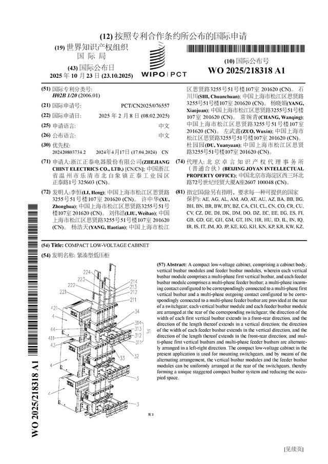 证券之星消息,根据企查查数据显示正泰电器(601877)公布了一项国际专利申请,专利名为“紧凑型低压柜”,专利申请号为PCT/CN2025/076557,国际公布日为2025年10月23日。