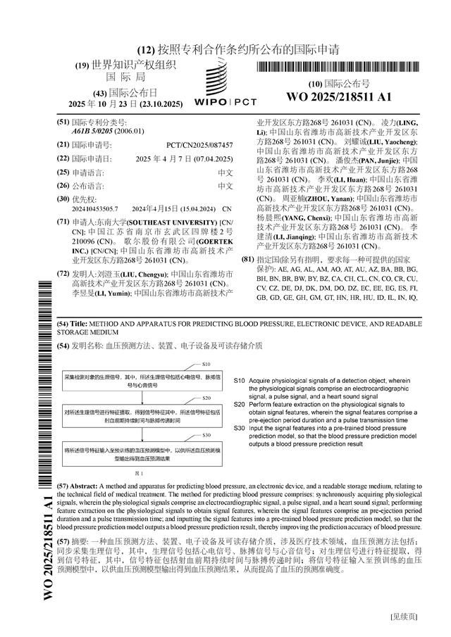 证券之星消息,根据企查查数据显示歌尔股份(002241)公布了一项国际专利申请,专利名为“血压预测方法、装置、电子设备及可读存储介质”,专利申请号为PCT/CN2025/087457,国际公布日为2025年10月23日。