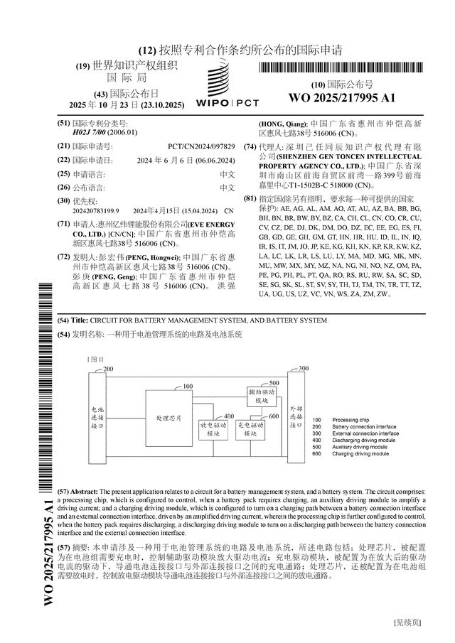 证券之星消息,根据企查查数据显示亿纬锂能(300014)公布了一项国际专利申请,专利名为“一种用于电池管理系统的电路及电池系统”,专利申请号为PCT/CN2024/097829,国际公布日为2025年10月23日。