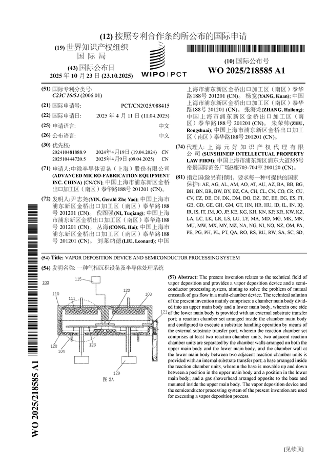 证券之星消息,根据企查查数据显示中微公司(688012)公布了一项国际专利申请,专利名为“一种气相沉积设备及半导体处理系统”,专利申请号为PCT/CN2025/088415,国际公布日为2025年10月23日。