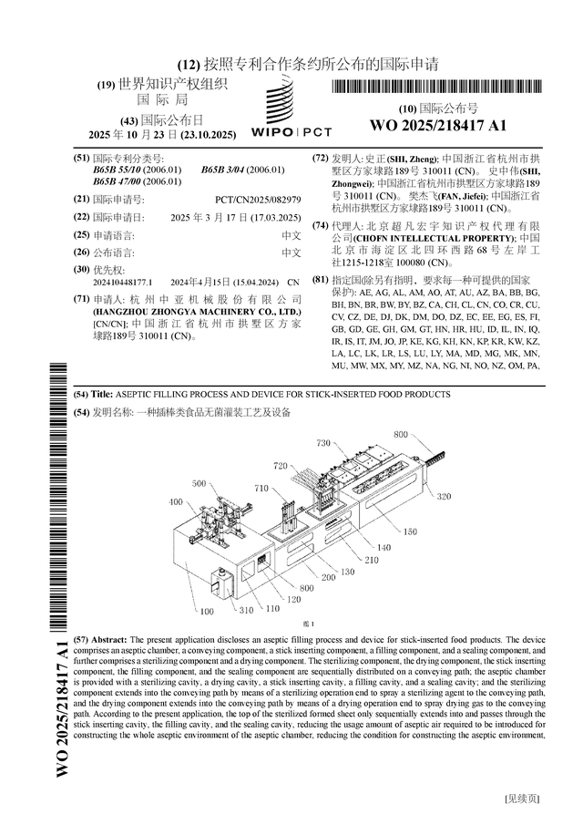 证券之星消息,根据企查查数据显示中亚股份(300512)公布了一项国际专利申请,专利名为“一种插棒类食品无菌灌装工艺及设备”,专利申请号为PCT/CN2025/082979,国际公布日为2025年10月23日。