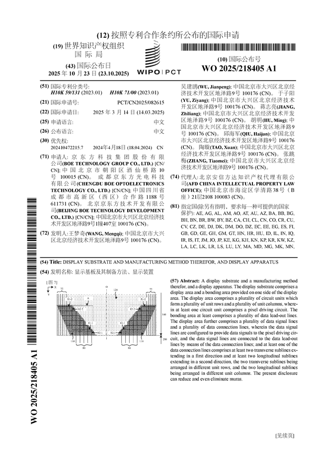 证券之星消息,根据企查查数据显示京东方A(000725)公布了一项国际专利申请,专利名为“显示基板及其制备方法、显示装置”,专利申请号为PCT/CN2025/082615,国际公布日为2025年10月23日。